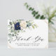 Este elegante e personalizável cartão de agradecimento de casamento apresenta um lindo buquê de flores rosa naval e azul, folhas de eucalipto verde à aguarela e moldura geométrica dourada moderna. Encontre mais designs e variações correspondentes na minha loja "blissweddingpaperie". ou sinta-se à vontade para entrar em contato comigo para mais personalização ou itens correspondentes.