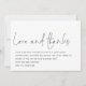 Casamento Fotográfico de Obrigados de Amor com Script Moderno. O amor e os obrigados estão em um estilo escrito à mão com os detalhes abaixo. Muito espaço branco no topo para um toque contemporâneo! Personalize facilmente o resto do texto para seus próprios detalhes e substitua a foto de amostra no verso por sua própria, que automaticamente mudará para preto e branco. Se desejar remover os filtros preto e branco, clique em personalizar mais e escolha a opção de filtro e selecione Sem filtro ou uma opção de filtro diferente.