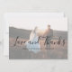 Cartões de agradecimentos de casamento de fotos modernas com design simples e na moda com "Amor e Obrigados" em uma tipografia elegante com seus nomes e data de casamento sobre sua foto horizontal favorita. O fundo tem uma segunda foto quadrada e sua mensagem personalizada.