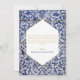 Este design apresenta padrões azulejos portugueses russos. O texto do casamento é elegantemente enquadrado com uma forma geométrica branca e dourada. Design de casamento floral azul e branco Azulejo único com elementos modernos. Os convites de casamento e outros artigos de papelaria também estão disponíveis.