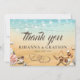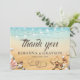 Casamento de praia tropical obrigado cartas com um amarelo-pálida rústico a azul-d'água, estrelas, conchas, luzes de cordas, dois corações na areia com suas iniciais, e um elegante modelo de apreciação de casamento que é fácil de personalizar.