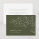 Ilustração de flor desenhada à mão delicada e elegante e detalhes de tipografia moderna, em verde sage escuro e branco, simples e romântico. Ótimos cartões de agradecimento florais para casamento rústico moderno, casamento de jardim campestre e casamento boho simples no verão e inverno.