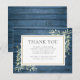 Um cartão memorial de funeral elegante com folhagem botânica em aquarela sobre um fundo de madeira azul rústico. Você pode personalizá-lo com sua própria mensagem de agradecimento. Criado por Thisisnotme©