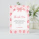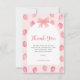 Este fofo cartão de agradecimento de chá de bebê de menina com tema de morango apresenta morangos em aquarela e um laço com tipografia em rosa em um fundo em arco. É facilmente personalizável. Aquarela Original © Michele Davies