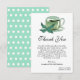 Faça uma declaração de gratidão com nosso cartão de agradecimento exclusivo para chá de noiva Festa do Chá Única. Este cartão distinto apresenta um design cativante com folhas de chá verde e uma encantadora xícara de chá, simbolizando a essência de uma celebração de chá. A parte traseira do cartão apresenta um belo fundo de bolinhas em verde pastel, adicionando um toque de capricho e elegância. Com um modelo de mensagem exclusivo criado especificamente para um chá de noiva, expressar sua gratidão se torna fácil. Diga 'obrigado' de uma maneira memorável com este extraordinário Cartão de Agradecimento para Chá de Noiva. Por favor, clique no botão personalizar para personalizá-lo com seu texto ou nome. Visite minha loja "loveyouart" para outros designs semelhantes ou relacionados.