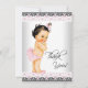 Cartão de agradecimento de chá de bebê menina com fundo de renda rosa e preto e adorável bebê menina vintage usando calças com babados, sapatos rosa e laço rosa no cabelo. Este lindo cartão de agradecimento de bebê menina em estilo flat rosa é facilmente personalizado adicionando sua mensagem no estilo de letra, tamanho e cor, e redação de sua escolha, ou deixe em branco para adicionar sua mensagem manuscrita após chegarem.