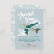 Este cartões de agradecimentos de chá de bebê bonito apresenta um viagem de avião azul, com céu azul e nuvens. Também há espaço para você adicionar sua própria mensagem de obrigado.