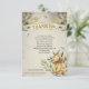 design de chá de fraldas "Obrigado" com um ursinho de pelúcia, rústico, apinhado entre diferentes tonalidades de verde e rodeado por um trio de abelhas melíferas sobre fundo marrom-aquoso. Design composto por Holiday Hearts Design (direitos reservados).