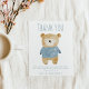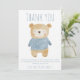 Expresse sua gratidão com este adorável cartões de agradecimentos com uma ilustração de urso doce vestindo um suéter azul macio. O design mínimo e pastel é perfeito para os meninos e apresenta uma mensagem sincera com texto de nome de família. Ideal por enviar agradecimento aos seus convidados pelos seus presentes pensativos e desejos gentis.