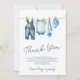 Encerre a sua celebração com este Cartões de agradecimentos corajoso que apresenta a essência do bebê pintado à mão. As bordas de aquarelas e roupas de bebê azul macio em uma linha de roupa combinam perfeitamente com o tema do chá de fraldas jean azul. Este cartão pensativo facilita o obrigado de convidados por seu amor, apoio e presentes pensativos enquanto você se prepara para receber seu pequeno.