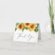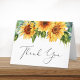 Cartão de agradecimento dobrado para chá de noiva rústico. A frente apresenta buquês de aguarela de flores de girassol e folhagens de eucalipto e "Obrigado" em um script de caligrafia estiloso. No interior, personalize sua mensagem de agradecimento e adicione seu nome em um script semelhante a uma assinatura, ou deixe em branco para uma nota manuscrita.