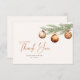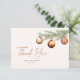 Cartão de agradecimento minimalista neutro para chá de noiva com ramo de pinheiro pintado à aquarela decorado com enfeites de bola de Natal.