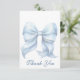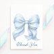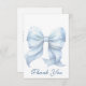 Envie uma nota sincera de gratidão com este Cartão de Agradecimento para Chá de Noiva com Laço Azul Personalizado. Com um design de laço elegante que combina com o conjunto de convites de seu casamento, este cartão é perfeito para agradecer aos convidados após o seu chá de noiva ou chá de bebê. Com uma mensagem personalizável, você pode adicionar um toque pessoal para mostrar sua apreciação com estilo.