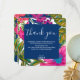 Este cartão de agradecimento de chá de noiva floral e botânico apresenta flores de aguarela em cores rosa, roxo e pêssego e folhas em tons brilhantes de verde com rosa quente ao fundo. Um convite de chá de noiva floral colorido perfeito