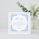 O cartão de agradecimento do chá de noiva em azulejo azul e branco exala elegância com sua mistura de elementos de design moderno e charme mediterrâneo. Os padrões de azulejo pintados à mão adornam as bordas, criando uma moldura cativante para os detalhes do evento. Acentos delicados de aquarela evocam uma sensação de tranquilidade e beleza, estabelecendo o tom perfeito para uma celebração inesquecível.