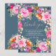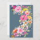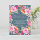 Chá de noiva em aquarela floral ousada boêmia cartão de agradecimento com flores pintadas à mão, flores cor-de-rosa, laranja, amarelo e folhagens eucalipto e folhagem índigo com uma fonte moderna de pincel de caligrafia em azul empoeirado. Convite de noiva perfeito para a primavera e verão, para tema de festa no jardim e ao ar livre.