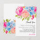 Um cartão de agradecimento de chá de noiva floral em aquarela rosa e azul e verde boêmio charmoso com flores pintadas à mão e flora com folhagem verde. Um chá de noiva de jardim charmoso com uma fonte de letra moderna tipo pincel.