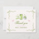 Este cartão de agradecimento Chá Revelação com Tigrinho de Matcha apresenta deliciosos desenhos de sobremesas de matcha, tons pastel suaves e charmosos detalhes de laço em fita combinados com letras em estilo elegante para um visual fofo e feminino. A arte caprichosa em estilo coquete e o tema divertido de matcha tornam-no uma peça coordenada adorável para chás de noiva com tema de matcha, celebrações de chá e papelaria feminina e pastel dentro da suíte Perfect Matcha.