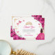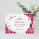 Fuchsia pink, gold and white Quinceanera thank you card. Features brunette girl in ball gown dress, script font, gold butterflies, hot pink roses and tiara. Perfect for an elegant princess style glam celebration. Personalize with your own details.