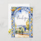 Cartão de agradecimento para chuva de noiva com arco de azulejos majólica italianos azuis e limões, arco de azulejos azuis em aquarela e frutas cítricas com paisagem italiana ao fundo, tema de cores azul escuro, branco e amarelo.