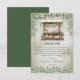 Belo design de "Agradecimento" de chuva de noiva de floresta e eucalipto verde-sage boutique Farmer's Market - parte da coleção "Fresh Off the Market". Fundo frontal com aparência envelhecida rústica combinado com o suporte de madeira carregado de verde e o eucalipto circundante é reminiscente de um mercado italiano ou rural ao ar livre. A parte de trás apresenta uma cor sólida verde floresta simples.