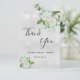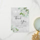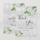 Um cartão de agradecimento para Chuva de Presentes de Casamento. Uma cor de fundo metálica prateada falsa. Decorado com flores brancas, folhagens e poeira cintilante falsa. Na frente, uma grande letra manuscrita e o texto: Obrigado, seu texto, título e data.