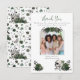 Este cartão de agradecimento para Chuva de Presentes Irlandesa gótica elegante apresenta ilustrações temáticas irlandesas e góticas desenhadas à mão em tinta preta, mostrando um crânio adornado com rosas verdes, folhas, frutos, flores silvestres e trevos verdes. A parte de trás apresenta um padrão correspondente com esses mesmos elementos.