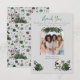 Este cartão de agradecimento elegante para Chuva de Presentes Irlandesa Bridal gótica apresenta ilustrações temáticas irlandesas e góticas desenhadas à mão em tinta preta, mostrando um crânio adornado com rosas verdes, folhas, frutos silvestres, flores silvestres e trevos verdes. O verso apresenta um padrão correspondente com esses mesmos elementos.