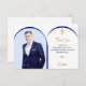 Adicionar uma foto de tamanho vertical. Um quadro fotográfico em forma de arco azul. Personalize e adicione um nome e detalhes.