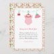 Este adorável conjunto de roupa de bebê em aquarela com tema de morango, acompanhado por um cabide de morango, sapatos e chapéu de bebê pendurados em uma videira, serve como um delicioso centro de mesa para um cartão de agradecimento de chá de bebê. Contra um fundo de padrão de flores de morango formando um arranjo em forma de coração de videiras, este design evoca uma sensação de alegria e expectativa. Ao simplesmente clicar no botão azul "Personalizar", você pode personalizar facilmente o convite com os detalhes desejados, garantindo uma experiência sem estresse.