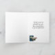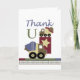This thank you card design comes with a dump truck setting on top of a box with a star and a cement truck at the base on top of red, green and blue stripe over same shades of plaid.