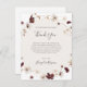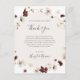 Este cartão de agradecimento de flor silvestre de cor burgundy cobre é perfeito para o seu casamento clássico rústico boho com tons de ferrugem, branco e marsala. O design apresenta uma grinalda boêmia ou buquê de flores silvestres modernas em aquarela roxa, vermelha, cinza e rosa desbotado, juntamente com folhagens de laranja queimado e dourado. Apresentados no design estão papoulas e cevada. O design é ideal para um casamento simples e minimalista de outono ou verão de outono, primavera no jardim campestre. Por favor, encontre outros artigos de papelaria de casamento correspondentes ou coordenados no restante desta coleção.