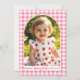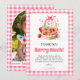Cesta com morangos, corações e laço rosa Cartão de agradecimento de primeiro aniversário Berry. Celebre o "Aniversário da Berry" com este adorável cartão de agradecimento de foto. Seu design doce centra-se em uma cesta transbordando cheia de morangos vermelhos vibrantes, acentuados por corações caprichosos e um delicado laço rosa. O texto divertido "Muito obrigado, Berry" é artisticamente colocado junto com sua mensagem personalizada. Uma moldura clássica xadrez rosa-choque envolve esses elementos, criando uma estética encantadora e pronta para um piquenique. O verso do cartão apresenta uma foto adicional do seu bebê, apresentada em uma adorável moldura arqueada.