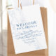 Guide your guests in coastal style with this wedding weekend events card featuring an elegant dusty blue Corolla, NC map. The front includes a warm welcome message in navy blue, while the back showcases a clear weekend itinerary schedule. Perfect for an Outer Banks wedding at The Whalehead Club, The Currituck Club, The Chesapeake, The Black Stallion, or The Three Authors. Artwork by Coastal Map Designs.