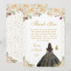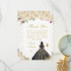 This elegant and glamorous sweet sixteen thank you card features a beautiful princess with dark hair and dark skin in a black ball gown. The text combines handwritten script and modern sans serif fonts for a classy and sophisticated look. The floral arrangements, butterflies and gold confetti create the perfect blend of rustic and chic.