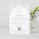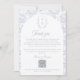 Dusty Blue Monogram Crest Wedding Thank you card: Vintage-inspired line art monogram crest with elegant dusty pale blue typography. Features a chinoiserie floral pattern in the shape of an arch and on the reverse for timeless sophistication. Elegant script font for a formal and classic style. Let your guest get access to your wedding online photo album or photo website.