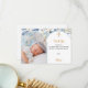Adicionar uma foto de tamanho vertical. Um pequeno arco azul colorido em forma de fotograma. Uma cor de fundo branca, decorada com forais azuis, flores. Personalize e adicione um nome e detalhes.