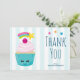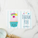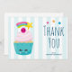 Um cartões de agradecimentos plano com fundo azul claro e listrado branco. Camadas sobre o topo é um cupcake azul giro com glacé rosa e um rosto sorridente kawaii. Uma cereja em cima também tem um rosto bonito. Uma estrela cadente está voando no ar. Personalize com sua própria mensagem no verso. Pequenas estrelas decoram a design.