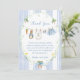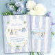 This cute baby bunny clothesline theme features a custom hand-painted frame of a crisp blue vertical stripe pattern accented with a lush greenery wreath, creating a clean, classic, and welcoming look. A sweet watercolor clothesline is strung across the center, proudly displaying tiny, adorable items, each featuring a cute bunny dressed in blue. The scene is completed with a darling blue bow holding a bunch of fresh carrots, and bright, cheerful daffodils, all rendered in a soft watercolor style. A heartfelt thank you message is included, you can easily change it and add your own details and change the font style, size color and placement if you would like to.