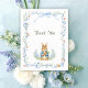 Thank your guests for celebrating the arrival of your little one with this classic storybook-inspired baby shower Thank You Card. Featuring a charming, hand-painted watercolor bunny holding a carrot, this design is framed by delicate blue ribbons, whimsical bows, and soft garden florals.