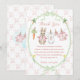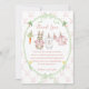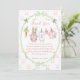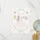 The invitation features a custom hand-painted frame of a crisp pink ribbon pattern accented with a lush light green ribbon wreath, creating a clean, classic, and welcoming look. A sweet watercolor clothesline is strung across the center, proudly displaying tiny, adorable items, each featuring a cute pink clothed bunny. The scene is completed with cute fresh carrots, and bright, cheerful daffodils, all rendered in a soft watercolor style. Easily add your own details and change the font style, size color and placement if you would like to. A heartfelt thank you message is included, you can easily change it and add your own details and change the font style, size color and placement if you would like to.