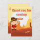 Bela cartões de agradecimentos de aniversário do Cowboy Ocidental - A celebração foi um sucesso e agora é hora de enviar obrigado para todos que fizeram este pequeno aniversário de rodeio tão especial. Oeste temido fundo do deserto com um adorável vaqueiro em xerife vest, botas de vaqueiro, chapéu e lasso na frente, enquanto o dorso tem um vaqueiro no seu cavalo em tons laranja castanhos. Você pode alterar a fonte e a cor do texto se quiser.