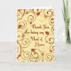 Cartão de agradecimento da dama de honra para casamento de outono em cores elegantes e clássicas, com padrão de folhas e espirais festivas. A maneira perfeita de agradecer à sua dama de honra no Dia de Ação de Graças ou no casamento de outono. Também disponível em convites, etiquetas e envelopes.