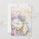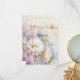 Um cartão de agradecimento de casamento muito bonito com uma dália branca com acentos em roxo e azul.