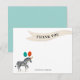Este cartão de agradecimento plano tem muito espaço para escrever uma simples mensagem de "obrigado" aos doadores de presentes de aniversário após a celebração e apresenta uma faixa divertida e uma zebra vestindo um chapéu de festa segurando balões.