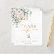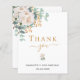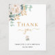 Um cartão de agradecimento de aniversário de 50 anos (ou qualquer idade) moderno e elegante. Um fundo branco chic. Decorado com uma flor branca, flor (peônia) e folhas de eucalipto pintadas com aquarela verde, raminhos, folhagens e um ramo falso dourado. Letras pretas e douradas. Na frente o texto: Obrigado, nome e data.