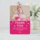 Envie um cartão de agradecimento super especial para seus convidados, agradecendo por terem comparecido à sua festa e gratidão pelos presentes. Com a sua foto favorita do seu aniversário/batizado/chá de bebê/festa com texto divertido que diz "OBRIGADO" e "eu adorei o bolo e os presentes também, mas a minha parte favorita foi ver você! OBRIGADO POR TER VINDO À MINHA FESTA E PELO PRESENTE MARAVILHOSO". "MUITO AMOR" e "NOME DELES"