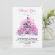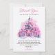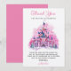 Celebre o primeiro aniversário do seu pequeno com este encantador cartão de agradecimento de aquarela de castelo rosa, perfeito para expressar gratidão com um toque de magia de conto de fadas.