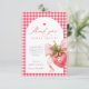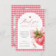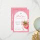 Diga obrigado da maneira mais doce com este cartão de agradecimento gingham vermelho, apresentando morangos em aquarela, letra cursiva suave e um detalhe de laço rosa. Um par perfeito para o tema de aniversário de um ano de menina berry.