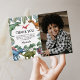 Cartão de agradecimento de aniversário jurássico com um fundo preto simples, uma foto doce da sua criança, folhagem verde de selva, uma coleção de dinossauros aquarela e um modelo de agradecimento personalizado moderno e fácil de personalizar.